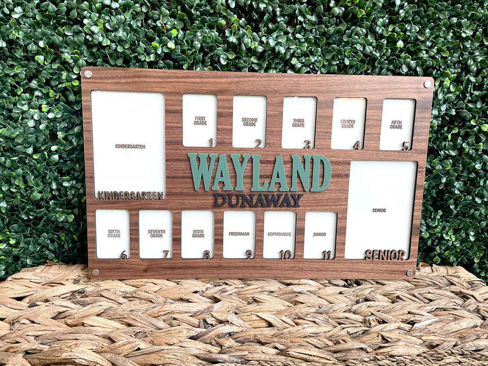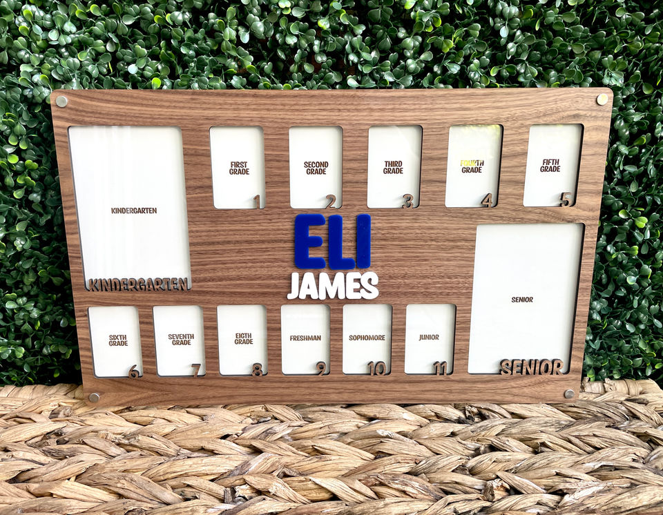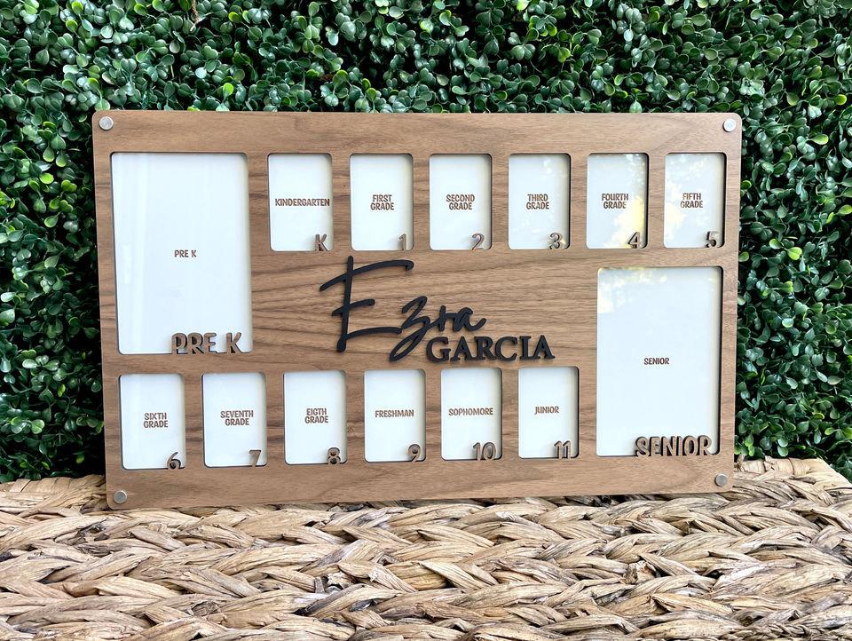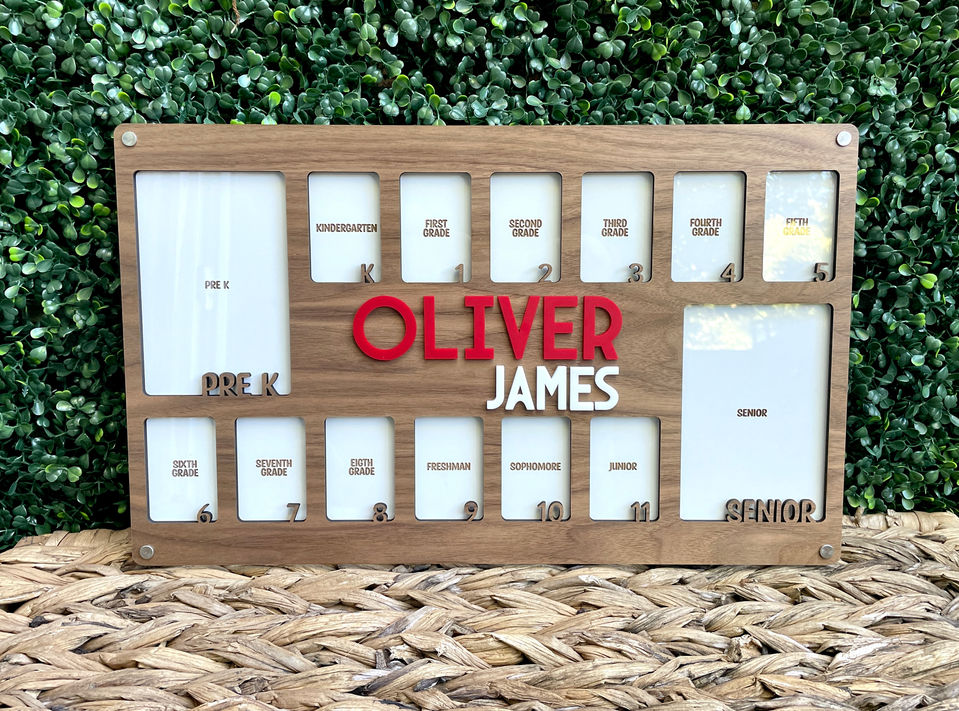 Capture the memories of your little one and watch them grow with these School Photo Board frames. Included with each board is the back piece to represent where each photo goes, an acrylic layer in the middle to give it that true photo frame feel, and then the top layer to bring it altogether. Small photos are 2x3 (pocket size) and larger photos are 4x6. All helf together by chicago screws to make it easy to interchange the photos as your little one grows.